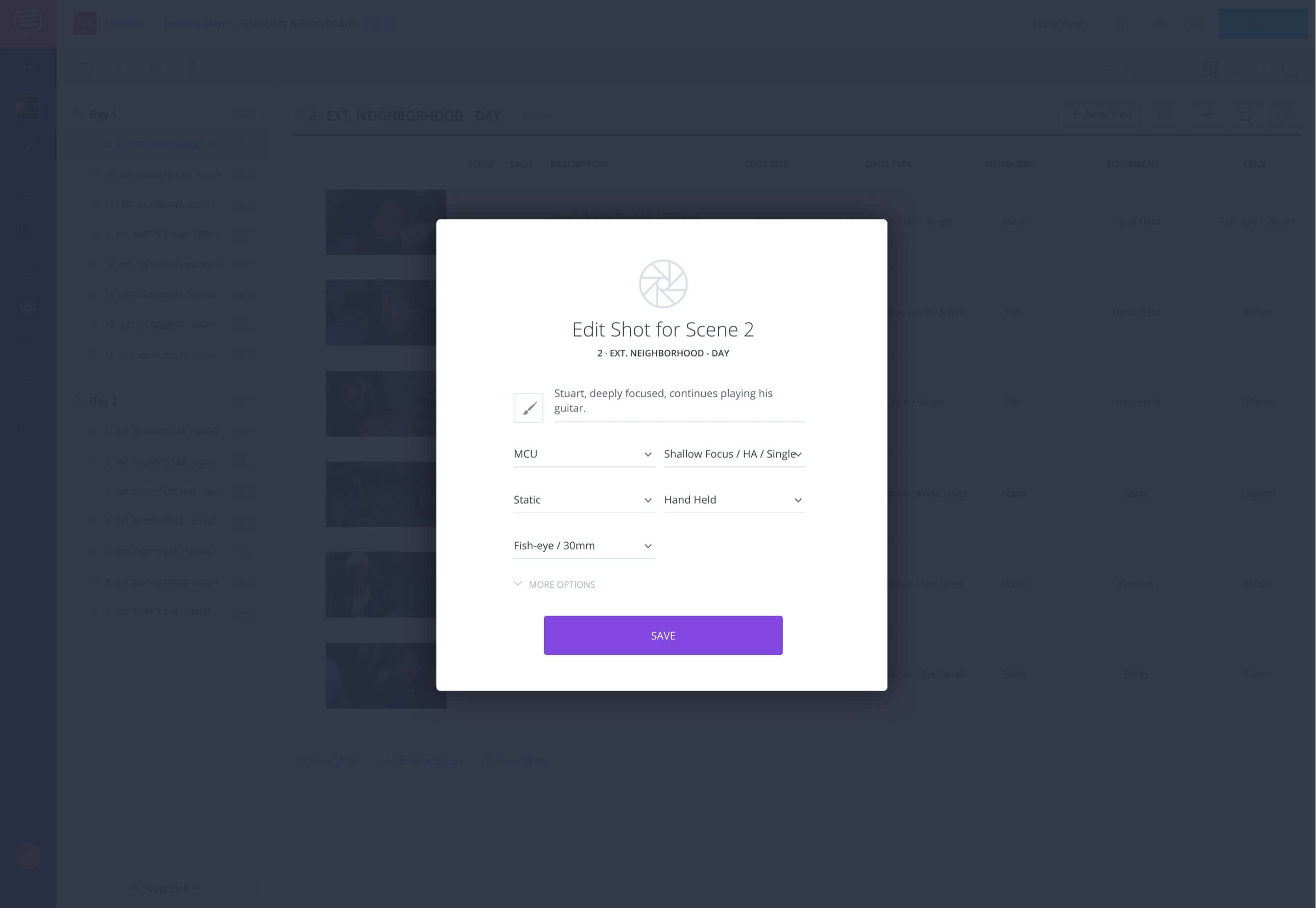 Celtx Studio shot lists and storyboards give you fewer opportunities to describe and plan your creative goals. Sections can't be customized to your desires. Our shots lists allow you to create setups and estimated times for each shot.