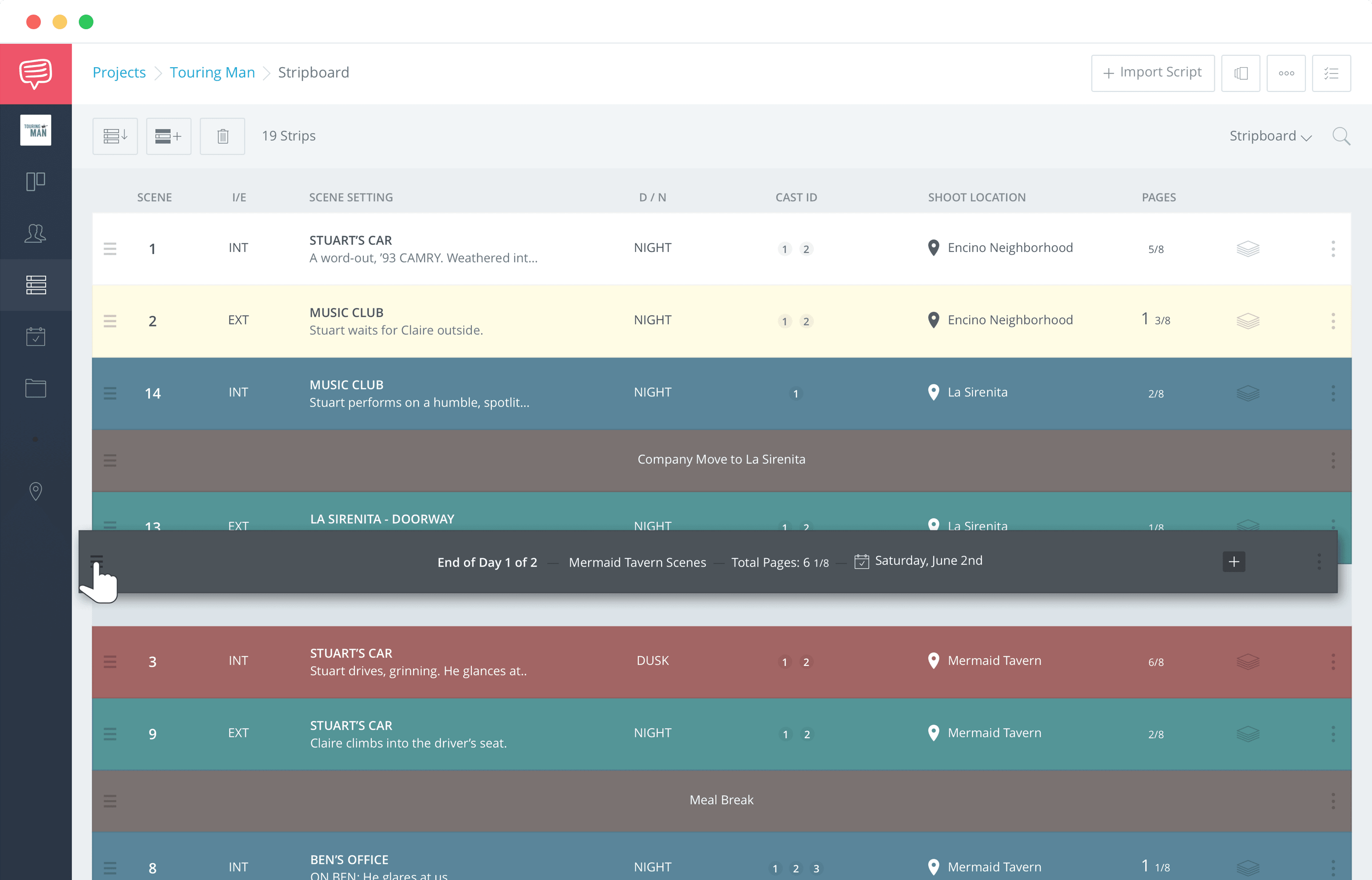 Drag and drop scene strips to reorder. Building a shooting schedule doesn't have to eat up time.